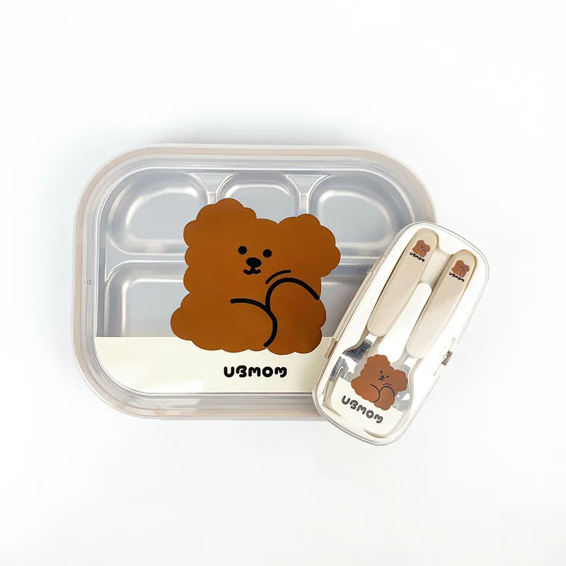 Ubmom 不銹鋼餐盒- 朱古力MongMong狗 📍物料: 不銹鋼/PP+矽膠 (耐熱溫度80℃) 📍重量:350g 📍尺寸:25cmX5.3cmX19cm 📍建議月齡:36個月以上 📍款式:朱古力Mong狗 🌟5格設計配置,飯餸,湯水,水果 一盤過ok👌🏻 🌟內深度12.5cm,湯水不易溢出 🌟蓋子矽膠部份,可分離拆洗清潔冇死角 🌟不銹鋼材料不會殘留食物氣味或顏色 🌟不銹鋼3層結構,安全盛放熱食 🌟安全防漏,配合蓋子使用輕鬆存放攜帶 🌟韓國製造